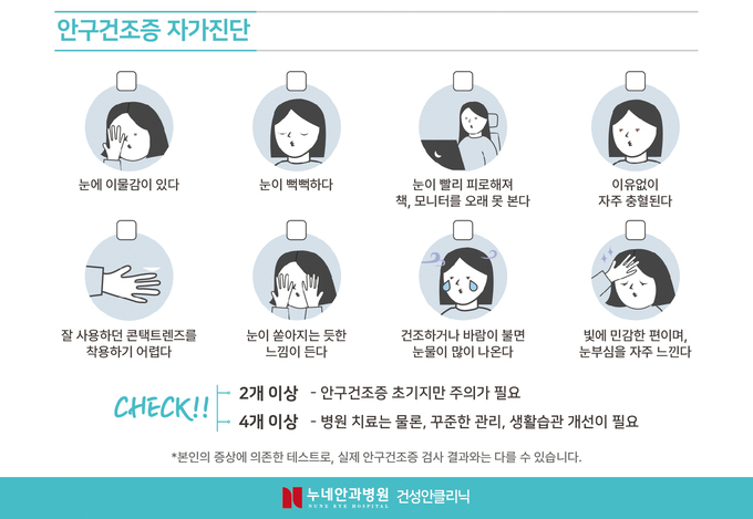 단, 안과 전문의들은 건조한 날씨가 지속되고 눈에 건조함 때문에 점점 통증이 생기거나 이물감이나 충혈 시림 등의 증상이 심하다면 안과에 가서 진료를 받는 것이 좋고, 특히 인공누액 점안을 지속적으로 하고 있음에도 증상이 가시지 않을 경우 빠르게 안과를 찾을 것을 권고한다.