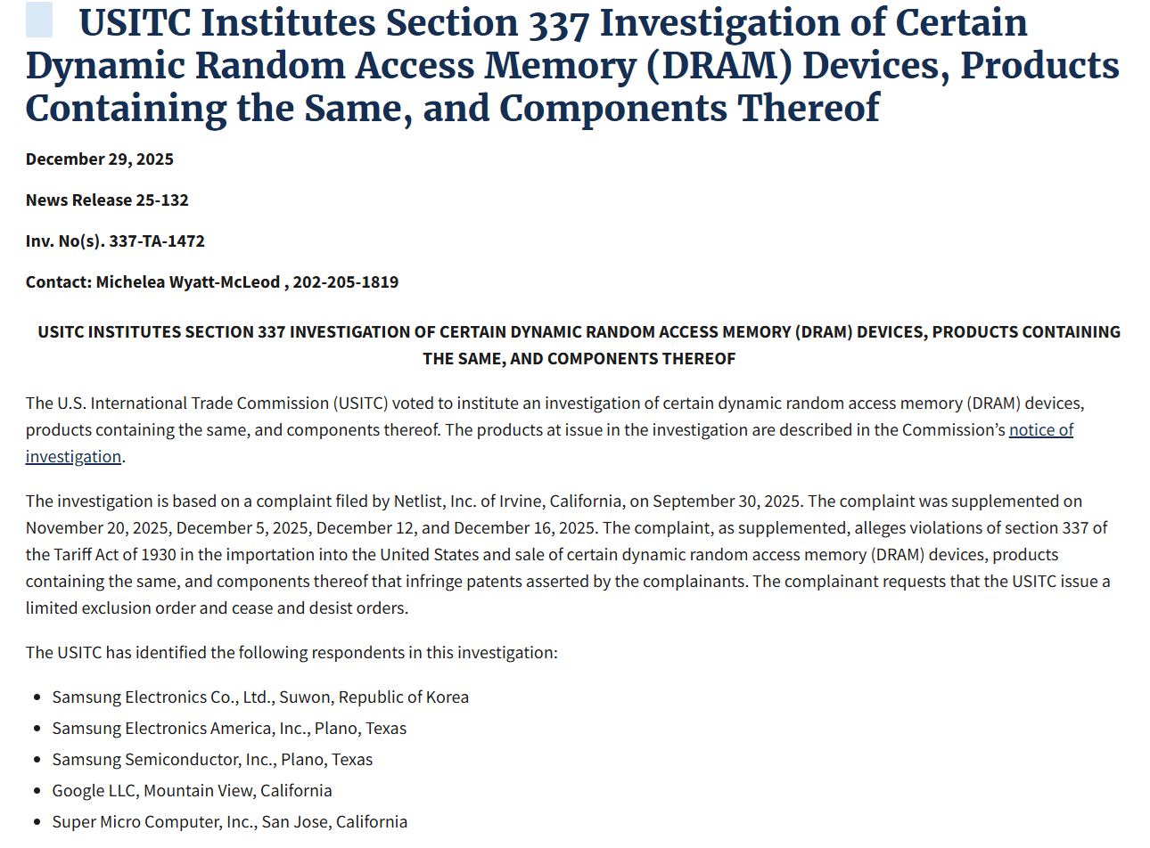 넷리스트는 지난해 9월 삼성전자, 구글, 슈퍼마이크로컴퓨터를 상대로 특허 침해 소송을 제기하기도 했다. 이 회사는 미국 국제무역위원회(ITC)에 제한적 수입 금지 명령 및 판매 중지 명령을 발부해 줄 것을 요청했다. 미국 ITC는 이번 소송과 관련해 지난달 29일 보도자료를 내고 “미 ITC에 소속된 행정법 판사 중 한 명에게 해당 사건을 배정할 것”이라면서 “조사 완료 목표일은 조사 개시 후 45일 이내로 정할 것”이라고 밝혔다.