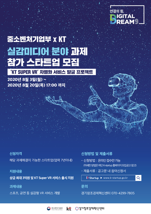 [세계비즈=한준호 기자] KT가 중소벤처기업부(이하 중기부), 경기창조경제혁신센터와 함께 실감미디어 생태계 확장을 위한 실감미디어 서비스 스타트업 공모전을 개최한다.