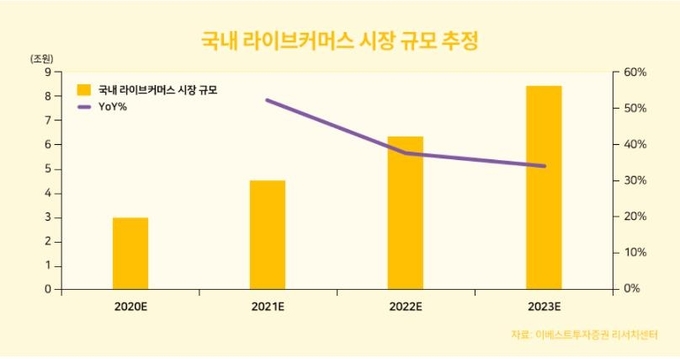 업계는 유통업체들이 라이브 커머스 서비스를 확대하는 배경에 시장 잠재성이 높기 때문으로 평가하고 있다. 오린아 이베스트투자증권 애널리스트는 지난해 3조원 수준으로 추정된 라이브 커머스 시장이 향후 2023년 9조원까지 성장할 것으로 내다봤다.