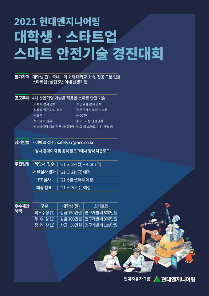 [세계비즈=박정환 기자] 현대엔지니어링은 현장 안전관리 수준 향상과 스마트 안전장비 및 안전기술 고도화를 목표로 ‘2021 스마트 안전기술 공모전’을 개최한다고 30일 밝혔다.