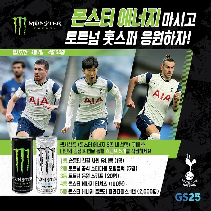 또한 14일부터 30일까지 몬스터 에너지 홈페이지에서 EPL 이벤트가 이어진다. 손흥민 응원 메시지를 남긴 응모자들을 대상으로 △1등(5명) 몬스터 에너지 1박스와 토트넘 공식 스타디움 모형 블록 △2등(15명) 몬스터 에너지 1박스와 토트넘 공식 응원 스카프 △3등(50명) 몬스터 에너지 티셔츠와 몬스터 에너지 축구 키링 경품을 제공한다. 당첨자는 5월 3일 몬스터 에너지 공식 네이버 포스트와 이메일 개별 연락으로 발표된다.