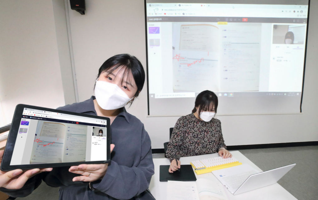 태인교육의 ‘파인듀’ 서비스를 이용하는 학원에서 강사가 KT 랜선에듀 서비스를 통해 실시간 화상 수업을 진행하고 있다. KT 제공