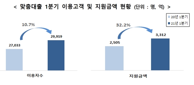 서민금융진흥원(이하 서금원)은 올해 1분기 맞춤대출서비스 이용고객수가 2만9919명, 금액은 3312억원을 지원했다고 16일 개최한 비대면 실적 간담회에서 밝혔다. 이는 전년 동기 대비 이용고객 기준으로 10.7%가 늘고, 금액은 기준으로 32.2%가 증가했다.