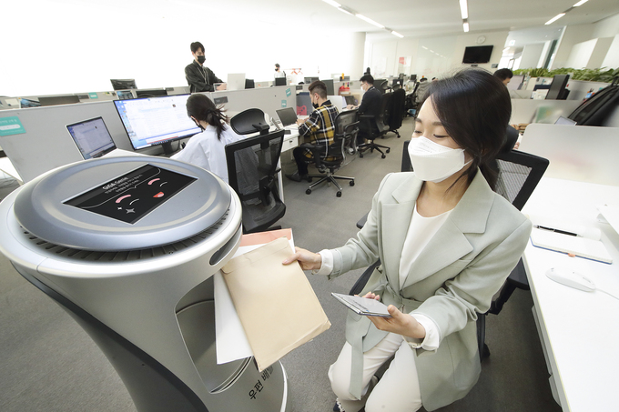 우편 지원센터 직원이 우편물을 로봇에 적재해 수령대상 직원이 근무하는 사무실을 입력하면, 로봇이 자율주행으로 스스로 엘리베이터에 탑승해 우편물 배송 목적지로 이동하는 방식이다. 이를 통해 배송 회전율을 높일 수 있으며, 임직원들은 손쉽게 우편물을 수령할 수 있어 업무 효율성도 높일 수 있다.