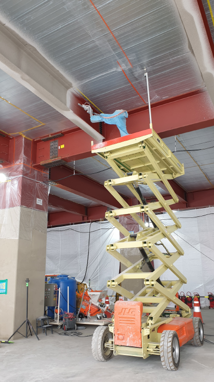 내화뿜칠은 건물의 철골 기둥과 보에 내화재(耐火材)를 덧칠해 높은 열에도 견딜 수 있게 하는 필수 작업이다. 근로자가 유독성 물질에 노출될 수 있고 높은 곳에서 작업해야 하는 상황이 많아 대표적인 고위험 작업으로 분류된다.