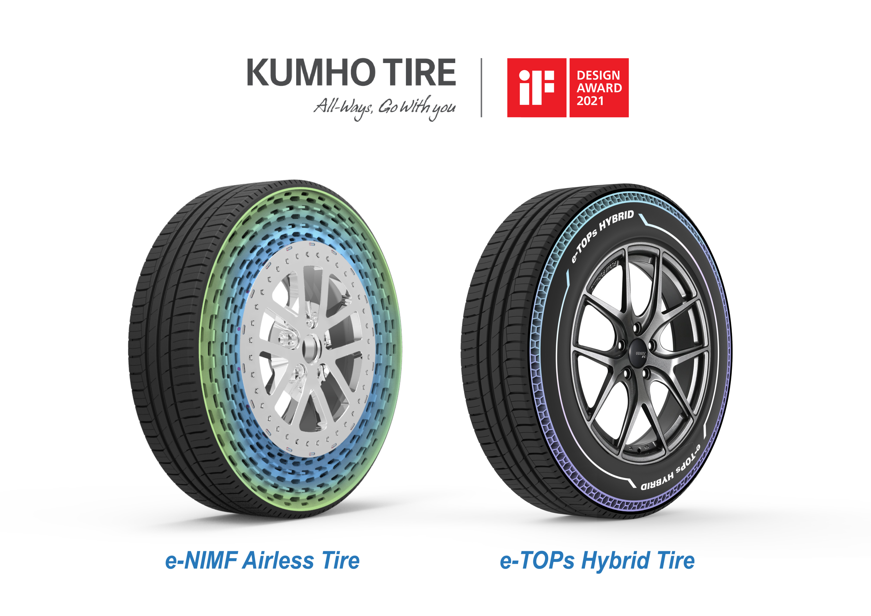 올해 금호타이어는 미래 지향적 기술력을 담은 컨셉타이어인 에어리스 타이어 e-NIMF와 하이브리드 타이어 e-TOPs가 수상의 명예를 안았다. 금호타이어는 특히 스마트 모빌리티 사회로 급변함에 따라 미래 자동차 시장을 선도할 수 있는 신개념 타이어 연구를 지속해왔으며, 이번 iF 수상을 통해 그간의 노력을 검증받을 수 있는 발판을 마련했다. 이번 수상 제품 외에도 금호타이어는 지속해서 차세대 미래 자동차를 겨냥한 타이어를 연구·개발하고 있다.