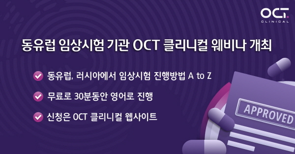 OCT는 웨비나를 통해 동유럽에서의 임상시험 승인 방법뿐만 아니라 △임상시험 승인 요청서 작성 방법 △원하는 시기에 맞춰서 임상시험 승인받는 방법 등 관련 기업들이 즉시 현장에 적용할 수 있는 다양한 노하우를 발표한다.
