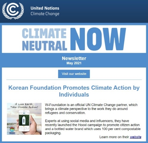 [세계비즈=이경하 기자] 유엔기후변화협약(UNFCCC)은 전 세계로 송출하는 5월 UN뉴스레터를 통해 더블유재단(W재단)이 유엔기후변화협약과 함께 협력하며 진행하고 있는 온실가스 감축을 위한 HOOXI 캠페인(후시앱, 후시워터 등) 내용을 소개했다고 14일 밝혔다.