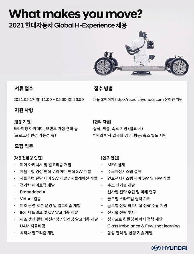 현대차 관계자는 “H-Experience는 미래 산업 환경에 적합한 융합형 인재를 조기 발굴하기 위한 인턴십 프로그램”이라며 “'모빌리티 솔루션 프로바이더'로서의 현대차를 경험할 수 있는 다양한 기회를 제공할 것”이라고 밝혔다.