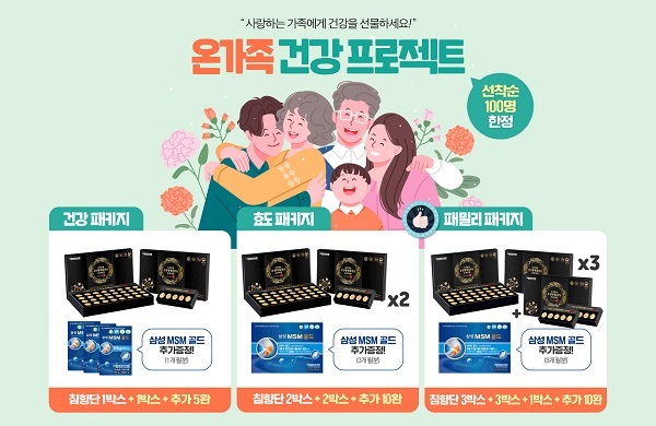 이번에 진행하는 6월 특별 프로모션은 △건강 패키지 △효도 패키지 △패밀리 패키지 등 다양하게 준비했다. 이 중 ‘패밀리 패키지’는 침향단 3+3 구성에 추가 1박스 및 체험분 10환과 함께 관절 건강 관리에 도움을 주는 ‘삼성 MSM 골드’ 3개월분을 증정한다.