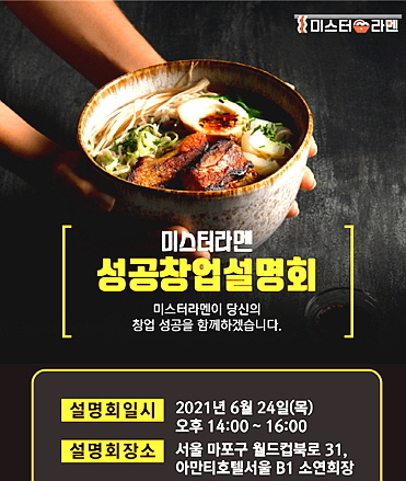 [세계비즈=이경하 기자] 일본 라멘 전문 프랜차이즈 미스터라멘이 오는 24일 서울 마포구 아만티호텔서울 소연회장에서 성공창업설명회를 개최한다고 2일 밝혔다.