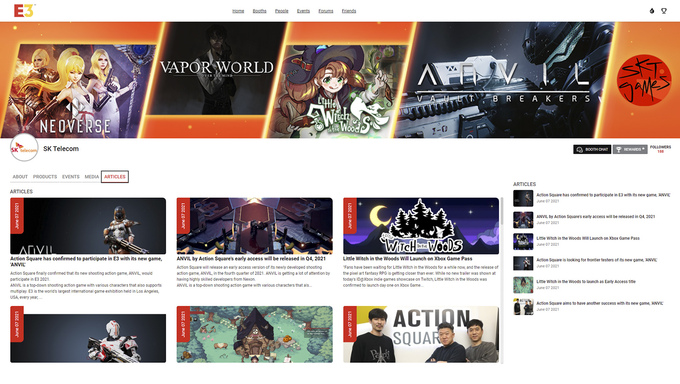 SKT가 이번 E3 2021에서 공개하는 퍼블리싱 게임은 액션 슈팅 게임 ‘앤빌’(액션스퀘어 개발), RPG게임 ‘숲속의 작은 마녀’(써니사이드업 개발), 액션 어드벤처 게임 ‘베이퍼 월드’(얼라이브 개발), 카드 액션 게임 ‘네오버스’(티노게임즈 개발) 등 4종이다.