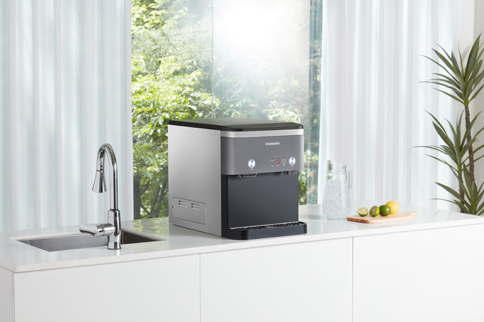 ‘청호 직수 얼음정수기 세니타 슈퍼’의 장점은 제빙기급 얼음을 생산하지만 가로 36㎝로 일반 가정용 카운터탑 얼음정수기 사이즈라는 점이다. 카운터탑형이라 싱크대 위에 설치할 수 있음은 물론 사무실, 카페 등에서 공간 제약없이 원하는 곳에 배치할 수 있도록 받침대도 별도 구매 가능하다.