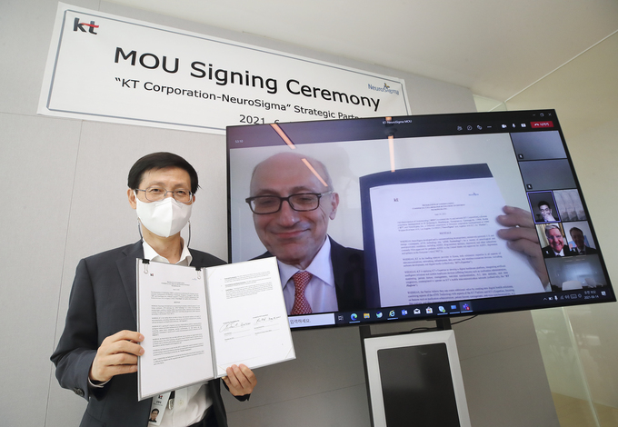 KT는 14일 뉴로시그마와 업무협약을 맺고 주의력결핍 과잉행동장애(ADHD), 우울증, 뇌전증 등의 신경정신질환을 치료하는 전자약 분야 제품개발과 사업화를 위해 협력한다고 밝혔다. 이번 업무협약은 각 사가 마련한 화상회의실에서 비대면 방식으로 체결했다.