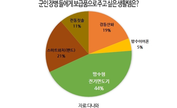 먼저 군인 장병 들에게 보급품으로 주고 싶은 제품은 무엇인가라는 질문에는 방수형 전기면도기(44%)가 가장 많은 응답수를 보였으며, 스마트와치(21%), 경등산화(19%), 전동칫솔(11%), 방수이어폰(5%)이 뒤를 이었다. 방수형 전기면도기를 선택한 응답자는 “신속하게 이용할 수 있어 유용하다”, “피부트러블을 최소화 할 수 있다”등의 이유를 제시했다.