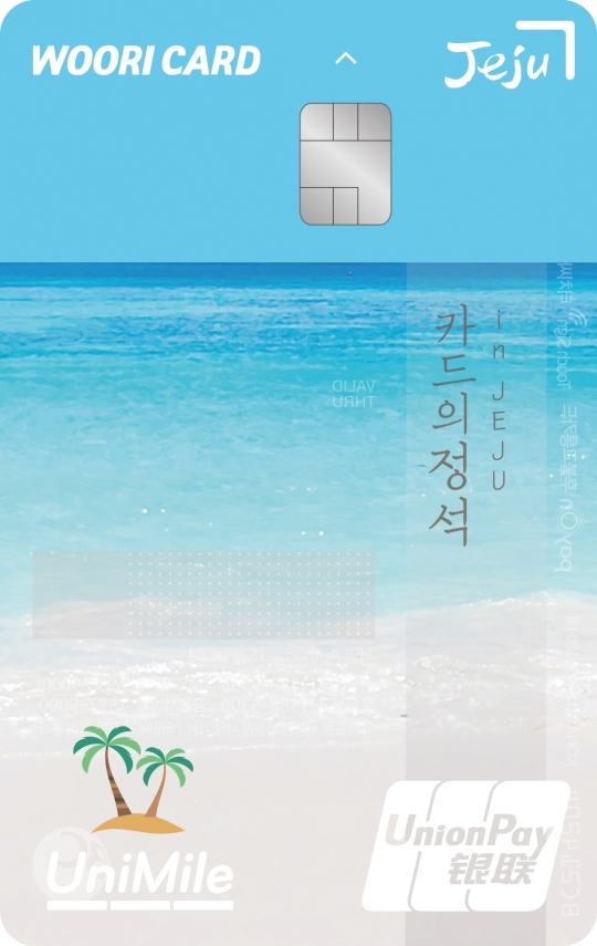 우리카드는 제주도 여행객을 타깃으로 한 ‘카드의 정석 유니마일 인 제주’를 판매 중이다. 해당 카드는 전용 홈페이지에서 항공권, 숙박, 입장권, 외식 결제시 5% 추가 할인 혜택을 제공하며 국내선 항공권의 경우 발권 수수료까지 면제된다. 제주항공, 진에어, 티웨이항공, 에어서울에서의 초과 위탁수하물 5㎏ 무료 혜택과 에어부산 위탁수하물 우선 처리 혜택도 제공된다. 저비용항공사 통합 마일리지 제도인 유니마일 적립 혜택도 가능하다.