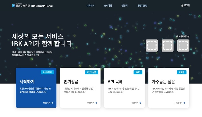 오픈API(Application Programing Interface)플랫폼은 사용자가 직접 응용 프로그램과 서비스를 개발 할 수 있도록 IBK의 금융서비스를 API방식으로 공개하고 통합 관리하는 개발자 지원 플랫폼이다.