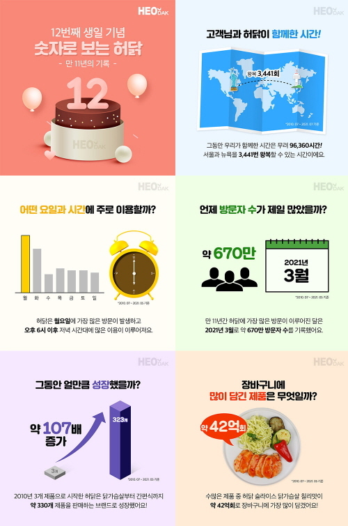 공개된 인포그래픽에 따르면 허닭이 고객과 함께 한 시간은 9만6360시간으로 서울과 뉴욕을 3441번 왕복할 수 있는 시간과 같다. 이용률이 높은 요일은 월요일이고 오후 6시 이후 많은 접속이 이뤄지는 것으로 나타났다. 그중에서도 가장 많은 방문이 이뤄진 시기는 2021년 3월로 약 670만 방문자 수를 달성한 것으로 확인됐다.