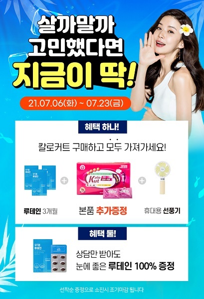 칼로커트는 7월 특별 혜택 이벤트를 통해 제품 구매 시 본품 추가 증정과 함께 눈 건강 루테인(3개월), 휴대용 선풍기를 지급할 예정이다. 이와 더불어 무료 상담만 받아도 루테인 제품을 100% 증정하는 혜택도 제공한다.