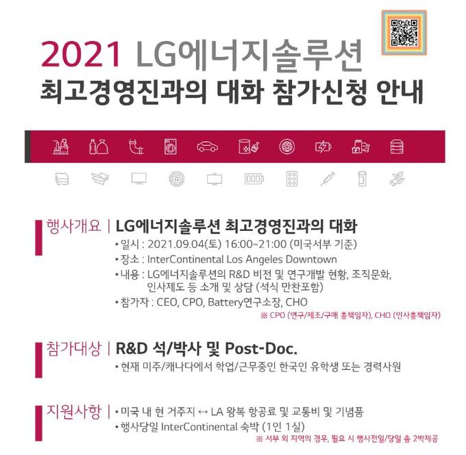 이번 행사는 미국과 캐나다에서 배터리 연구개발(R&D) 석박사와 박사후 과정(Post Doctor), 한국인 유학생 및 경력 사원 등을 대상으로 회사의 R&D 비전과 현황과 조직문화, 인사제도 등을 설명하고 채용 상담도 진행한다. 이 행사에는 김종현 최고경영자(CEO)와 김흥식 최고인사책임자(CHO), 정근창 배터리 연구소장(부사장) 등이 참석한다.