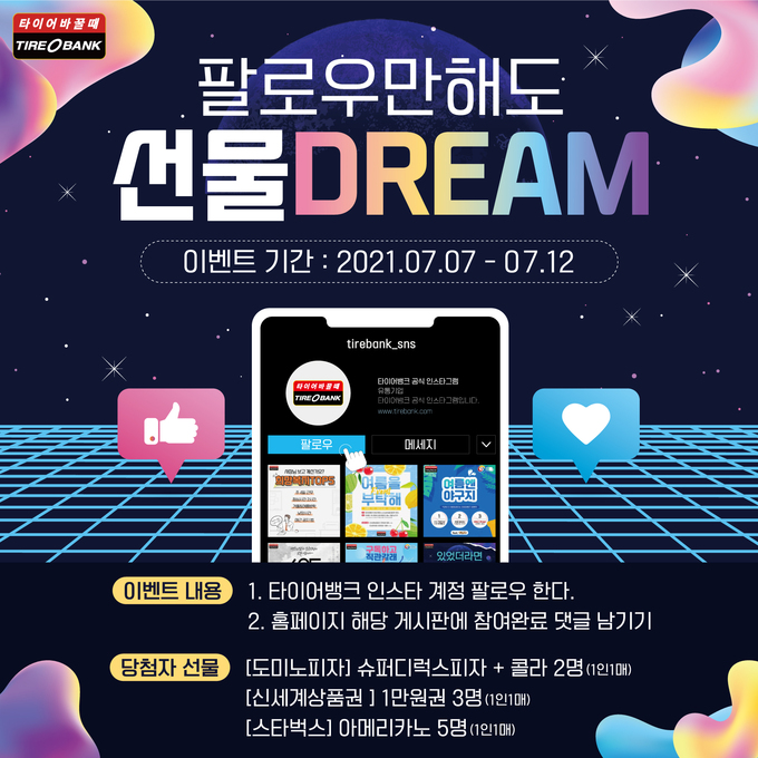 [세계비즈=권영준 기자] 타이어 유통 전문기업 타이어뱅크㈜(www.tirebank.com)가 ‘팔로우만해도 선물dream’ 이벤트를 진행한다