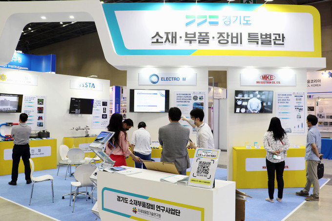 ‘경기도 소재·부품·장비 특별관’에 전시하는 소재·부품·장비산업 기술 자립화 연구지원과제의 전시 품목으로는 ▲ ㈜일렉트로엠-5G 및 차세대통신용 고주파수 손실특성이 우수한 연자성 소재와 자성부품 응용기술 ▲ 엠케이전자㈜-대기 접합용 비저항 2.0Ω·㎝ 이하 금속 코팅 은 와이어 ▲ ㈜네프코-고집적 반도체 패키지용 고투과 포토마스크 제조기술 ▲ ㈜센텍코리아-멤스 타입 접촉연소식 수소 가스 센서 ▲ 지인철㈜-선박 가스엔진 배기관내 고온고압 폭발방지용 안전밸브 ▲ ㈜아스타-TOF 질량분석 방식을 적용한 고속 잔류기체 분석기이다.