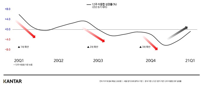 칸타 월드패널 분석 자료에 따르면, 커피전문점 시장 성장의 흐름을 봤을 때 코로나 확산 및 거리두기 단계 격상에 따라 성장에 있어 요동치는 모습을 보였다. 특히 2020년 말에는 확진자 급증으로 하락세가 뚜렷했지만, 21년에 들어 빠른 회복세를 찾아갔다.