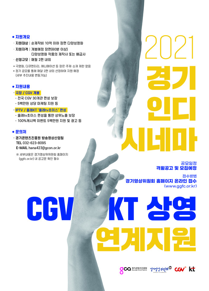[세계비즈=권영준 기자] KT가 경기콘텐츠진흥원, CJ CGV와 업무 협약을 맺고 7월부터 극장과 IPTV를 아우르는 ‘2021 경기인디시네마 CGV·KT 상영 연계지원’ 사업을 추진한다.
