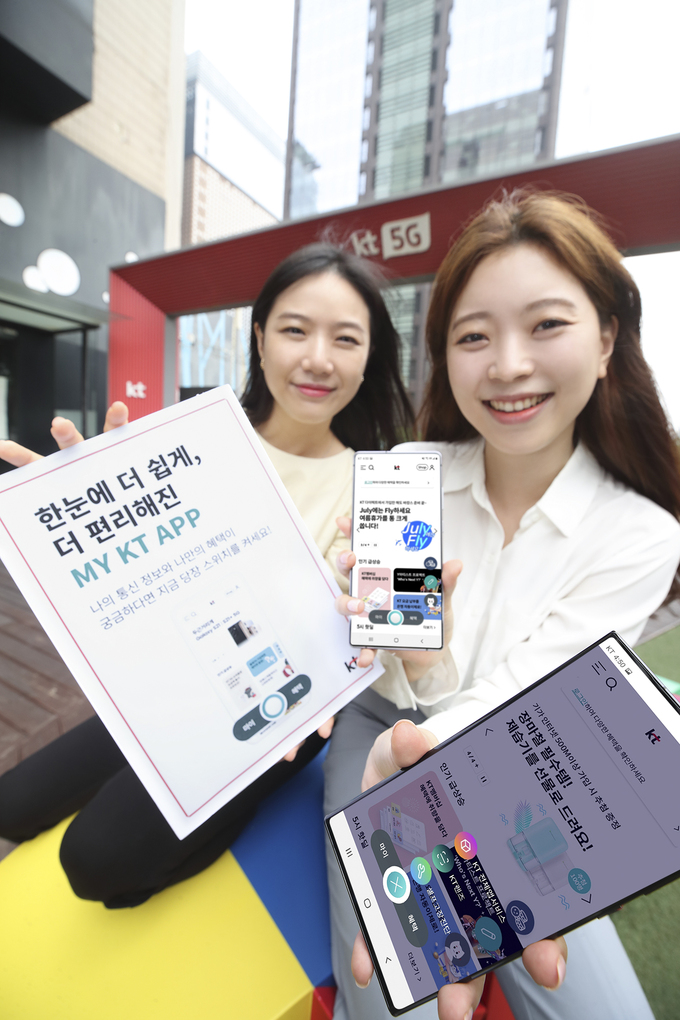 이번에 선보인 새로운 마이 케이티 앱은 마이, 홈, 혜택 3단의 직관적인 인터페이스로 앱 내 어느 페이지에서나 스위치 하나로 쉽고 편리하게 이동할 수 있게 구성됐다. 홈 화면 하단의 스위치 바에서 ‘마이’를 터치하면 가족 결합 정보를 비롯한 이용자 본인과 관련된 통신 서비스 이용 정보를 상세하고 직관적으로 확인할 수 있다. ‘혜택’을 터치하면 이용자의 연령이나 멤버십 현황, 서비스 가입 내역 등 고객 데이터를 기반으로 이용자에게 꼭 맞는 개인화된 풍성한 혜택을 한눈에 파악할 수 있다.