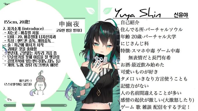 ‘신유야’의 정체는 버추얼 서울에 거주하고 있는 핸드폰 중독의 20살 대학생이다. 일본 애니메이션에 푹 빠져있고, 일본어에도 능숙하다. 주변에 일명 오타쿠(특정 취미에 푹 빠진 사람을 일컫는 말)와 소통하고 싶어 방송을 시작했다. 물론 여기까지는 가상으로 설정한 실체다. 신유야는 일본 버추얼 유튜버 그룹 및 프로젝트 총괄 기업 애니컬러 주식회사가 중국, 인도네시아, 인도에 이어 4번째로 한국에 진출하면서 만들어낸 버추얼 캐릭터이며, 이 캐릭터를 통해 유튜브 방송을 하고 있다. 애니컬러는 니지산지KR이라는 가상의 소속사를 만들어 신유야 외에도 다양한 캐릭터를 생성해 유튜브 방송을 하고 있다.