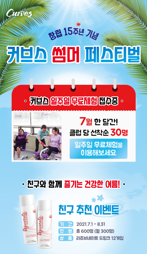 [세계비즈=박혜선 기자] 여성전용 피트니스 ‘커브스’가 창립 15주년을 맞아 7, 8월 두 달간 회원들을 대상으로 ‘썸머 페스티벌’을 개최하며 다양한 혜택을 제공한다고 21일 밝혔다.