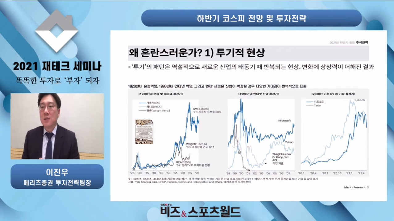 이진우 메리츠증권 투자전략팀장은 21일 세계비즈앤스포츠월드 주최로 열린 ‘2021 재테크 세미나’에서 이같은 내용을 담은 ‘하반기 코스피 전망 및 투자전략’에 대해 발표했다.