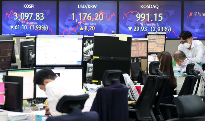 코스닥은 전 거래일 대비 29.93포인트(2.93%) 내린 991.15에 장을 마쳤다. 코스닥이 1000선 밑으로 내려간 것은 지난 6월 16일 이후 2개월여 만이다.