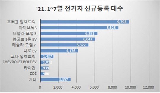 올해 새로 등록된 전기차 중에서는 포터Ⅱ(9793대)가 가장 많았다. 다음으로 아이오닉5(8628대), 테슬라 모델3(6291대), 봉고Ⅲ(6047대) 등의 순으로 나타났다.