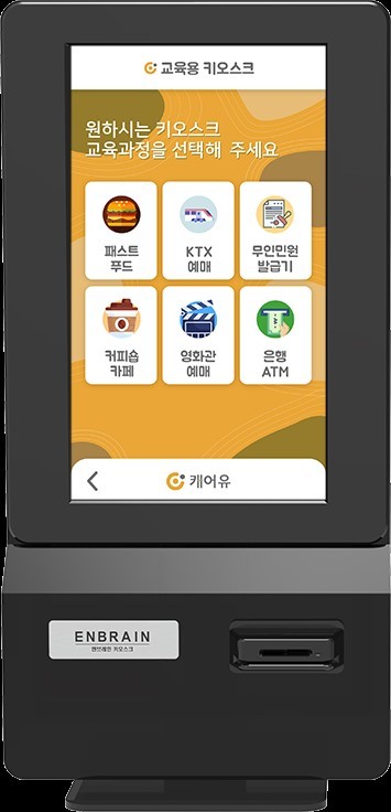 엔브레인 Kiosk는 일상생활과 가장 밀접한 카페와 패스트푸드 주문, KTX와 영화관 예매, 은행 ATM, 무인민원발급기 등 총 6종에 대한 키오스크 이용 방법부터 카드결제까지 교육과 반복 연습이 가능하도록 개발됐다.