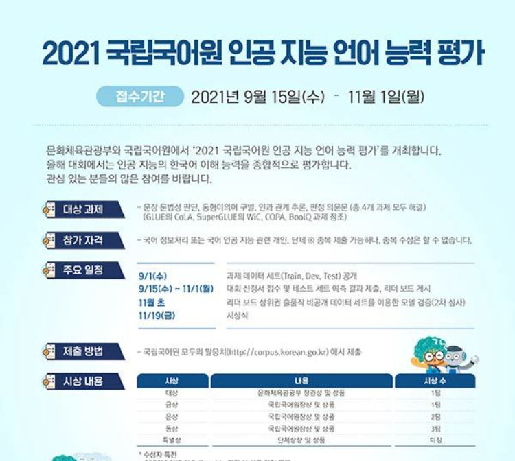 참가자들은 제공된 언어 모델 등을 기반으로 각각의 AI 언어모델 프로그램을 개발하여 우리말을 이해하고 분석하는 능력을 평가받는다. 자세한 행사 내용은 국립국어원 모두의 말뭉치 홈페이지에서 확인할 수 있다.