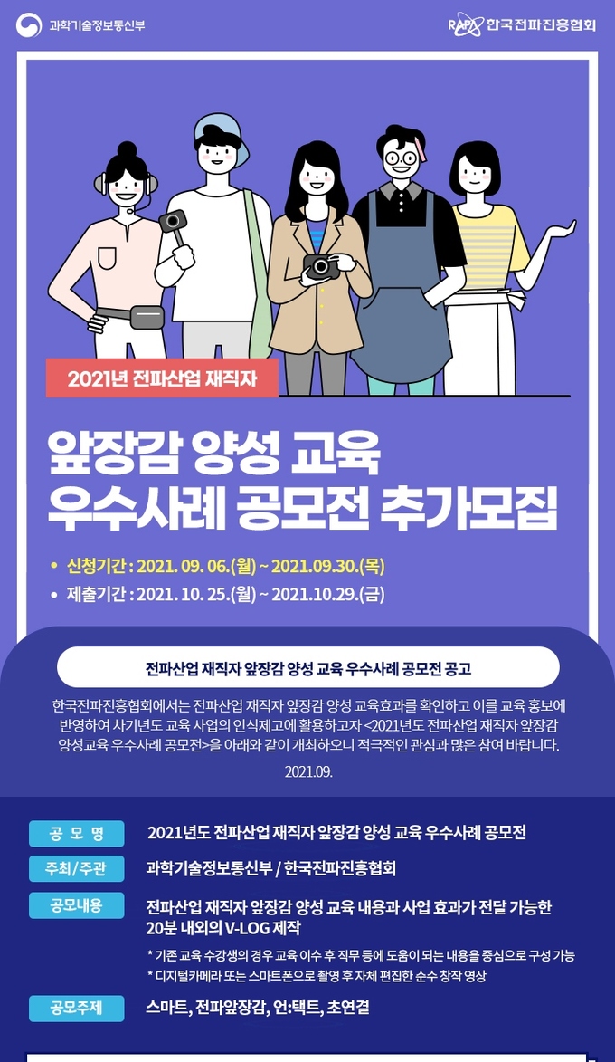 또한 ‘2021 전파산업 재직자 앞장감 양성교육 우수사례 공모전’ 추가모집도 진행 중이다. 공모전은 전파산업 재직자 앞장감 양성 교육효과를 확인하고 이를 교육홍보에 반영해 차기년도 교육사업의 인식을 제고하고자 기획됐다.