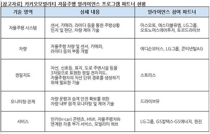 카카오모빌리티는 개별 자율주행 기술의 서비스화를 돕고, 이종 분야 간 협력을 촉진해 자율주행 기술의 상용화를 앞당기는 것을 목표로 ‘KM 자율주행 얼라이언스'를 공식 출범하고 업체 간 협력체계 구축에 나섰다. ▶︎시스템 ▶︎차량 ▶︎정밀지도(HD Map) ▶︎모니터링・관제 ▶︎연계 서비스 등 자율주행 각 분야에서 뛰어난 역량을 보유한 기업들을 파트너십으로 연결하고, 이들과의 사업협력, 공동 기술연구 등을 통해 각 파트너사가 보유한 다양한 솔루션을 통합하고, 상용화 가능한 수준의 완결성있는 자율주행 서비스로 선보인다는 계획이다.