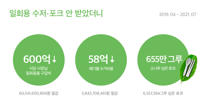 나아가 올 6월에는 '일회용 수저포크 안 받기'를 기본값으로 적용해 필요시에만 요청할 수 있도록 했다. 그 결과 일회용품을 받지 않는 비율은 지난해 6월 15.8%에서 올 6월 73%로 늘었다.