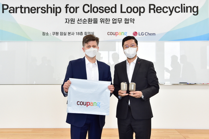 LG화학은 9일 서울 잠실 쿠팡 본사에서 LG화학 허성우 부사장과 쿠팡 라이언 브라운(Ryan Brown) 부사장 등 양사 경영진이 참석한 가운데 ‘플라스틱 재활용 및 자원 선순환 생태계 구축’을 위한 업무협약(MOU)를 체결했다고 밝혔다.