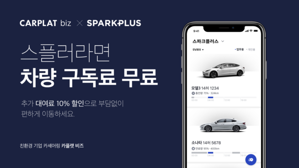 스파크플러스 입주사 소속 임직원이라면 누구나 '카플랫 비즈' 모바일 앱을 통해 올해 말까지 구독료 면제 및 차량 대여료 10% 할인 혜택 등을 적용 받아 업무용 공유 차량 이용이 바로 가능하고, 전국 하이파킹 및 하이그린파킹 주차장에서 추가 할인 혜택까지 제공된다.