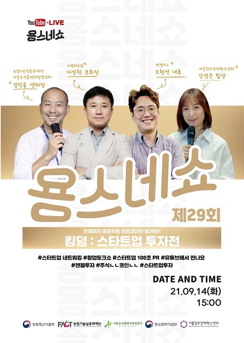 용스네는 농림축산식품부, 중소벤처기업부, 농업기술실용화재단, 서울창조경제혁신센터가 함께 운영하는 정기 스타트업 네트워킹 행사로, 스타트업 생태계 다양한 이슈에 대한 정보와 트렌드를 공유하며 인사이트를 제공하는 토크쇼다.