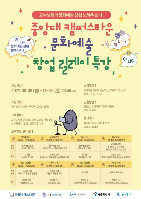 [세계비즈=박보라 기자] 중앙대학교 캠퍼스타운 추진단(단장 배웅규)이 동작구 관내 문화예술 분야 예비 창업인을 위한 ‘문화예술 창업 릴레이 특강’을 개최하고 참가자를 모집한다고 16일 밝혔다.