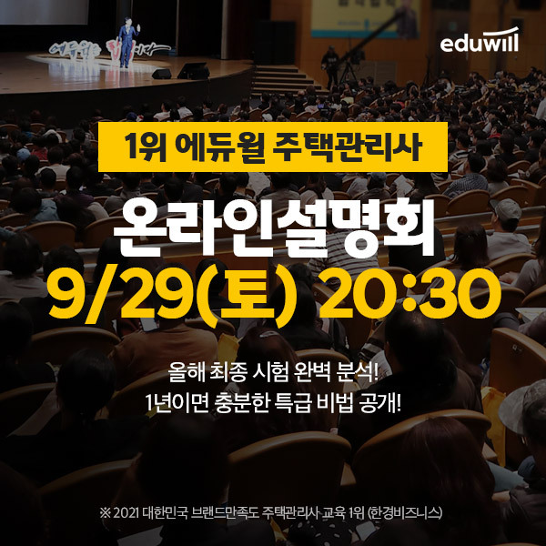 [세계비즈=박보라 기자] 종합교육기업 에듀윌(대표 박명규) 주택관리사는 오는 29일 오후 2시 ‘2022년 합격전략 온라인 설명회’를 유튜브 생방송으로 개최한다고 19일 밝혔다.