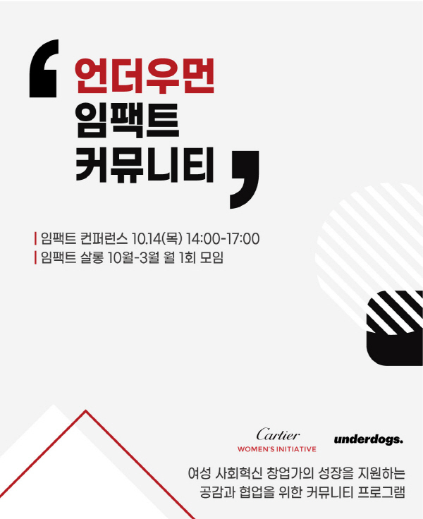 업체 측에 따르면 이번 언더우먼 임팩트 커뮤니티는 소셜 임팩트를 추구하는 초기 단계의 여성 창업가를 지원하는 글로벌 프로그램 까르띠에 여성 창업 이니셔티브의 후원을 통해 진행 대상을 기혼 여성에서 2040 전체 여성으로 새롭게 확장하고, 여성 사회혁신 창업가를 위한 컨퍼런스와 커뮤니티 프로그램까지 확대하여 진행된다.