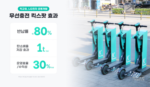 무선충전 킥스팟은 거치시 자동으로 충전되는 개인형 이동장치전용 거치대다. 킥고잉, LG전자, 부천시 간 협력을 통해 지난 5월 국내 최초로 부천시 역곡역 부근 5곳에 설치됐다.