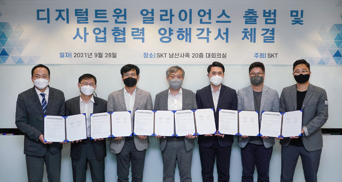 29일 SKT에 따르면 ‘구독형 디지털트윈 서비스’의 출시를 위해 다쏘시스템, 슈나이더일렉트릭, AWS(아마존웹서비스), SK플래닛, 플럭시티, 위즈코어, 버넥트, 한국전자기술연구원, 한국지능형사물인터넷협회 등 첨단 ICT 역량을 갖춘 20개 업체 및 단체들과 함께 ‘디지털트윈 얼라이언스’를 출범하고 사업협력 양해각서(MoU)를 체결했다.