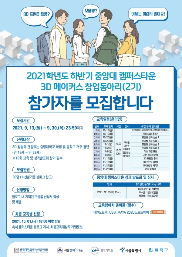 이에 3D 창업에 관심이 있는 중앙대학교 학생 및 만 18세 이상 39세 이하의 동작구 거주 청년이라면 누구나 신청할 수 있으며, 오는 30일까지 중앙대학교 캠퍼스타운 블로그에 게재된 구글폼 신청서를 작성해 제출하면 된다.