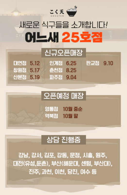 이는 음식점 창업 시장 전반이 침체된 상황에서도 사업 개시 2년 만에 이룬 성과라는 것이 업체 측의 설명이다.실제 고쿠텐은 경쟁 과열을 방지하고 점주의 영업권을 보장하기 위해 전국 80개 매장까지만 오픈하겠다고 밝힌 바 있다.